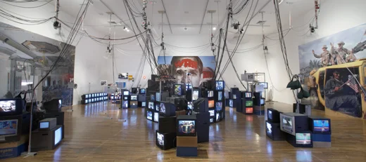 Kessler’s Circus places the viewer inside the American war machine. An army tent pitched inside the gallery housed mechanical sculptures and barracks stacked with video monitors. The work depicts the American military-industrial complex as a macabre circus, traveling from country to country, exporting atrocities under the veil of democracy. Rather than simply presenting a mediated spectacle, the artist indicts the audience in the violence. Surrounded by handmade mechanisms and surveillance cameras, the viewer becomes part of the machine. There is an induced sense of vertigo and a surge of paranoia, as the viewer’s own face appears in the video feed. Entering Kessler’s Circus, one is immersed in an undefined state, conflating machine and spectacle with entertainment and horror.